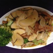 杏鲍菇、西兰花、肉丝、姜、虾皮粉、盐、蚝油、老抽、淀粉、蒜。