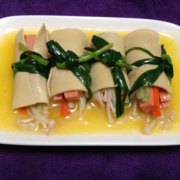 千张豆腐皮、火腿肠、西芹、金针菇、胡萝卜、韭菜。