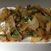 肺片、香菜、小米辣、蒜泥、花椒粉、生抽、香醋、盐、香菇粉。