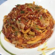 意式黄金面、自制蕃茄酱、腊肉、洋葱。
