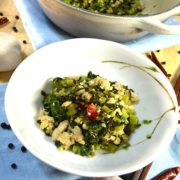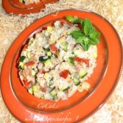 猪肉、西葫芦、自制迷你蕃茄干、冷白米饭、蒜末、特级初榨橄榄油、粗盐、黑胡椒粉、白葡萄酒、墨角兰。
