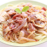 洋葱条、意面酱、口蘑片、直面、培根丁、粗黑胡椒、紫苏。