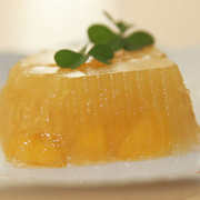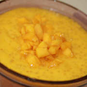芒果汁、芒果粒、凉开水、细砂糖、鱼胶片。