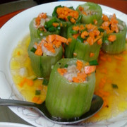 丝瓜、肉馅、胡萝卜、盐、花生油、生抽、鸡精。