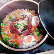 大米、卤牛肉、红菜椒、洋葱、葱、咸蛋、姜丝、油。