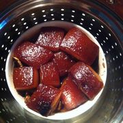 带皮五花肉、梅干菜、冰糖、生抽、老抽、黄酒、大蒜、姜片、葱。