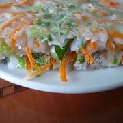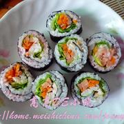 米饭、生菜、小银鱼、蟹肉棒、火腿、胡萝卜、番茄酱。