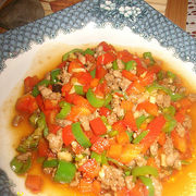 肉末、红柿子椒、绿尖椒、香菜、姜、蒜、面条、白菜、植物油、生抽、盐。