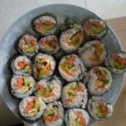 海苔、米饭、胡萝卜、黄瓜、腌萝卜条、鸡蛋饼、火腿、盐、糖、醋。