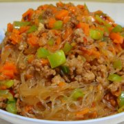 猪肉末、粉丝、胡萝卜、青椒、葱、姜、蒜、豆瓣酱、鸡精、食用油、香油。