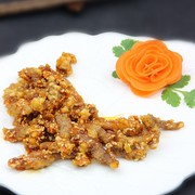 里脊肉、生粉、熟白芝麻、盐、花生油、大蒜瓣、白砂糖、番茄酱、鸡蛋清、白醋。