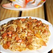 挂面、火腿肠、洋葱、牛肉、番茄、生姜、大蒜瓣、生抽、老抽、番茄酱、蚝油、盐、花生油。