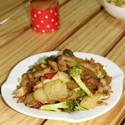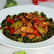 西兰花、猪肉、红椒、生姜、大蒜瓣、豆瓣酱、蚝油、生抽、白醋、花生油。