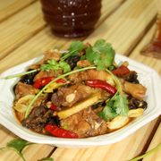 排骨、鸡爪、鸡腿、干木耳、土豆、包菜、泡椒、生姜、大蒜瓣、花椒、生抽、红油豆瓣酱、花生油、小葱、料酒。