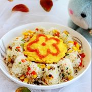 米饭、胡萝卜、牛肉、黄瓜、嫩玉米粒、鸡蛋、番茄酱。