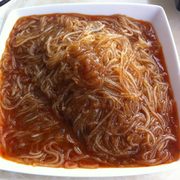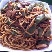细面条、五花肉、扁豆、葱末、蒜末、泰椒。