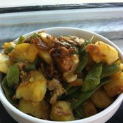豆角、五花肉、土豆、葱、泰椒、姜、蒜。