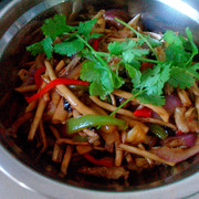 茶树菇、五花肉、青红椒、大蒜、豆鼓、洋葱、香菜。