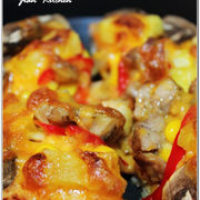 披萨底、彩椒、鸡肉块、口蘑、玉米粒、菠萝块。