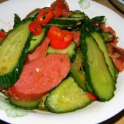 青瓜、火腿肠、辣椒、姜葱蒜、盐、鸡精、十三香。