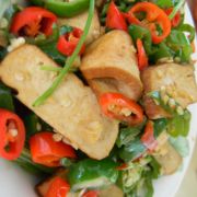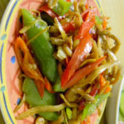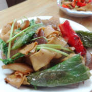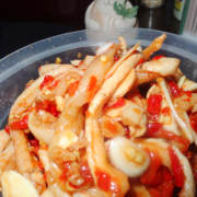 青椒、红椒、猪皮、豆皮、姜、蒜、盐、生抽、鸡精、五香粉。