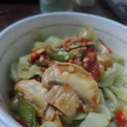 口蘑、香肠、菠菜面、辣椒、自制香辣酱、盐、鸡精、五香粉、生抽。