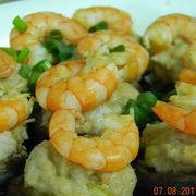 虾仁、香菇、瘦肉、上海青、姜、葱、蒜、生抽、盐、鸡精、生粉。
