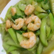 丝瓜、虾仁、姜、葱、蒜、盐、鸡精、十三香、生抽。