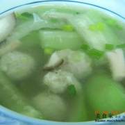 丝瓜、香菇、肉丸、葱、盐、鸡精、姜、蒜。