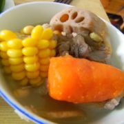 猪脊骨、红萝卜、玉米、莲藕、黄豆、生姜。