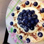 鸡蛋、细纱糖、低面筋粉、黄油、新鲜蓝梅、糖粉、大杏仁、牛奶巧克力、动物性奶油、细纱糖。