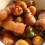 五花肉、鹌鹑蛋、青蒜叶、油、盐、料酒、酱油、冰糖。
