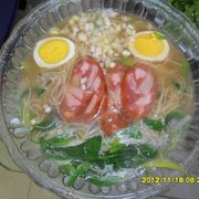 细挂面、带壳熟鸡蛋、迎宾火腿、菠菜、葱、姜、黑胡椒、酱油、盐、鸡精、醋。