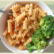 意大利面、猪肉末、西兰花、西红柿、胡萝卜、洋葱、橄榄油、番茄酱。
