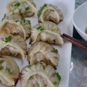 肉末、韭黄、杏鲍菇、中筋粉、鸡蛋、葱末、姜末、饺子调料、水、生抽、老抽、生粉、康乐醋。