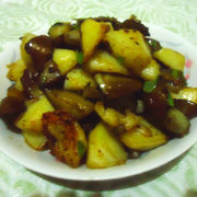 土豆、长茄子、油、盐、葱花、酱油、白糖。