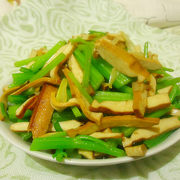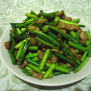猪肉、蒜苔、油、盐、葱花、酱油、鸡精、料酒。