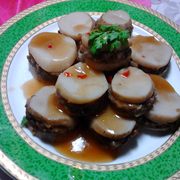 杏鲍菇、猪肉馅、葱、姜、淀粉、盐、鸡精、蚝油、酱油、五香粉。