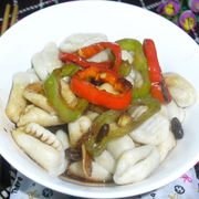 高筋面粉、绿豆面粉、青椒、红椒、水、酱油、大蒜、豆豉、盐、醋、糖。