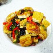 北豆腐、红椒、青椒、大蒜、姜丝、木耳、郫县豆瓣、盐、味精、胡椒。