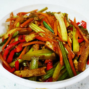 芹菜、香干、胡萝卜、红椒青椒、肉丝、盐、胡椒、鸡精、郫县豆瓣。