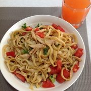 面条、鸡胸肉、西红柿、葱、蒜、花椒、醋、海鲜酱油、太太乐鸡汁。