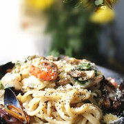 意大利面、虾仁、鱿鱼、蛤蜊、菠菜、洋葱、洋菇、蛋黄、橄榄油、白酒、起司、鲜奶油、黑胡椒粉、巴西里。