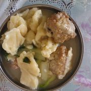 面粉、青菜、鸡蛋、肉圆、盐、香油。