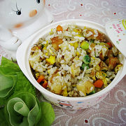 米饭、油条、鸡蛋、胡萝卜、葱、玉米粒、青豆、鸡精、盐、豆油。