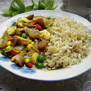 鱼丸、咖喱、洋葱、豌豆、洋葱、玉米、豆油、方便面。