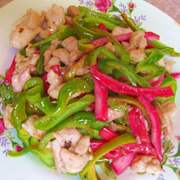 兔腿、火龙果皮、青椒、油、糖、淀粉、味精、盐、白胡椒粉。