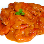 鲜大虾、红咖喱、椰浆、玉米淀粉、蒜头、洋葱、黄油。