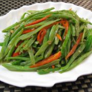 四季豆、大蒜、青椒、红椒、盐、鸡精。