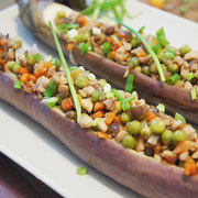 茄瓜、瘦肉粒、碗豆、茄瓜粒、红萝卜粒、姜片、葱花、蒜末、油、盐、胡椒粉、生抽。